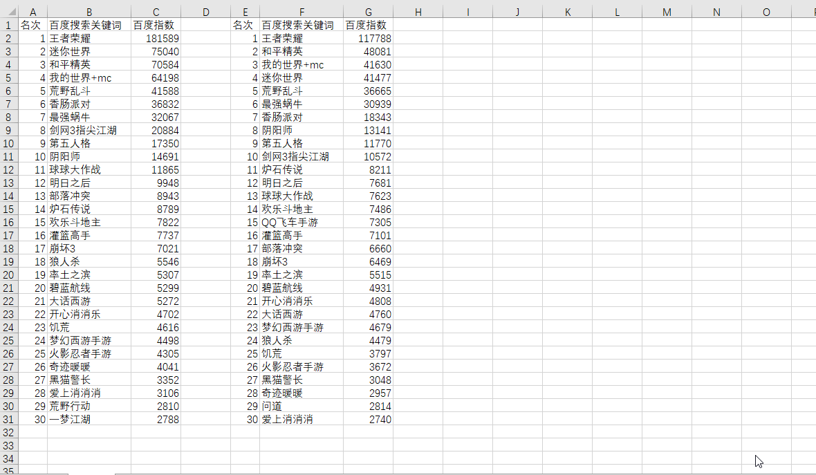 我的需求是右边的数据对比左边的数据,比如说迷你世界,右边的数据比左边的数据下降了2个排名,那我就需要在右边的数据中标出↓2并且将它们的文字颜色更改为绿色。
